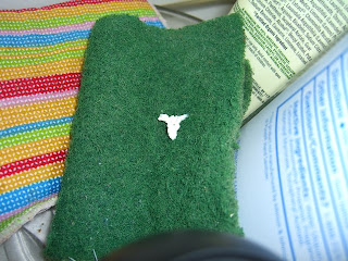 The other day my husband Plosswood summoned me to the kitchen: he'd been washing a few bits of cottage cheese off a plate, and then he had a vision. Some people see the Virgin Mary in a potato chip; he saw something very special on the scrubber. I saw the vision too, and took a picture of it. Taa daa!